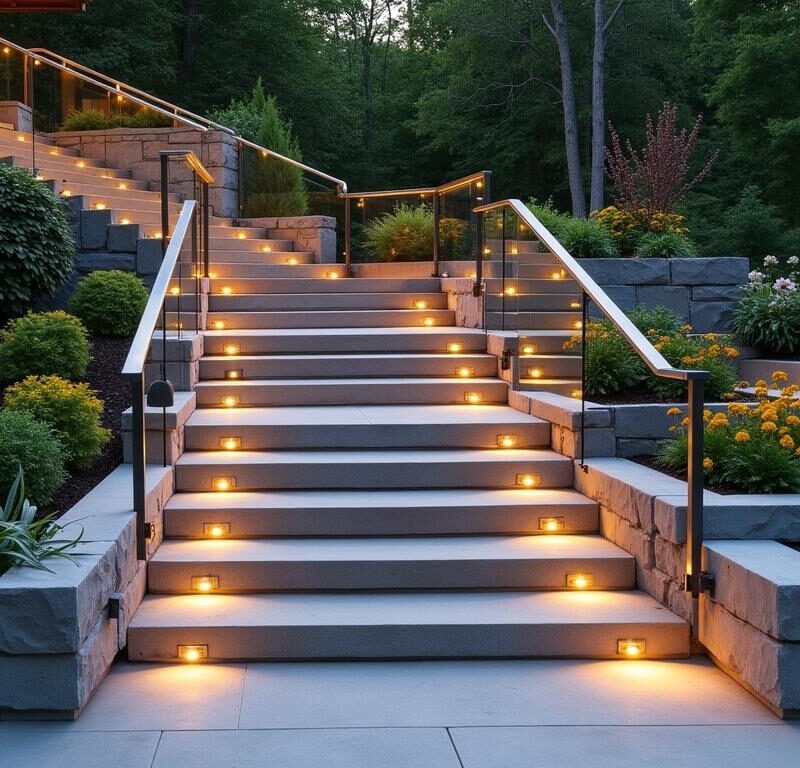 Good lighting for outdoor stairs further enhances safety when the sun goes down. Strategically placed outdoor stair lighting, such as LED strips under each step or fixtures mounted along the railing, guides the way after dark. Adding these lighting features to your patio stairs highlights your steps as an attractive focal point and encourages safer movement between levels in your yard.